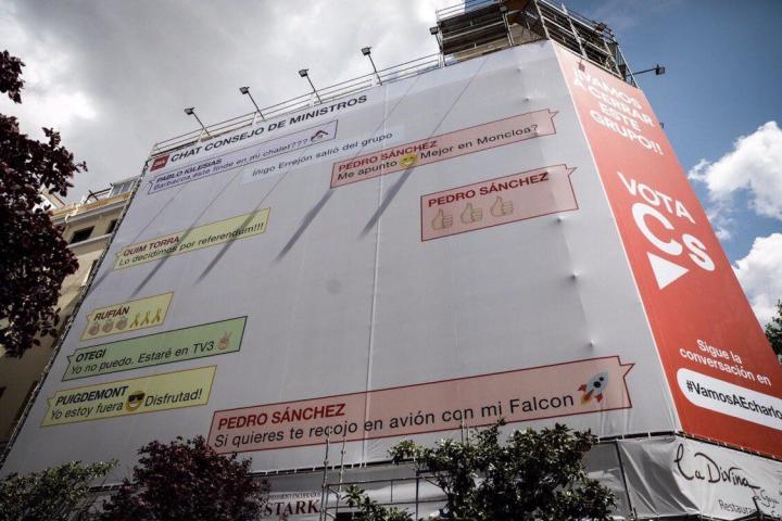 Ciudadanos ha desplegado una lona de grandes dimensiones, ocupando parte de un céntrico edificio de Madrid, donde recrea un chat del Consejo de Ministros y un diálogo inventado entre el presidente, Pedro Sánchez, y sus “ministros” Carles Puigdemont, Quim Torra, Arnaldo Otegi, Gabriel Rufián y Pablo Iglesias.
