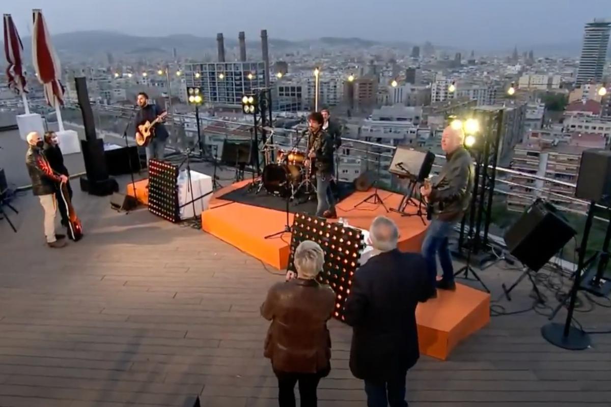 Edmundo Bal, diputado de Ciudadanos, con una gorra echada para atrás y chupa de cuero tocando la batería con la banda Vitamina C, creada para el evento, en lo alto de un edificio de Barcelona.