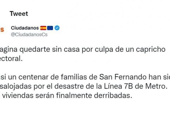 “Imagina quedarte sin casa por culpa de un capricho electoral. Casi un centenar de familias de San Fernando han sido desalojadas por el desastre de la Línea 7B de Metro. 54 viviendas serán finalmente derribadas. Un infierno que se alarga ya desde 2007”, han señalado desde la cuenta oficial de Twitter.