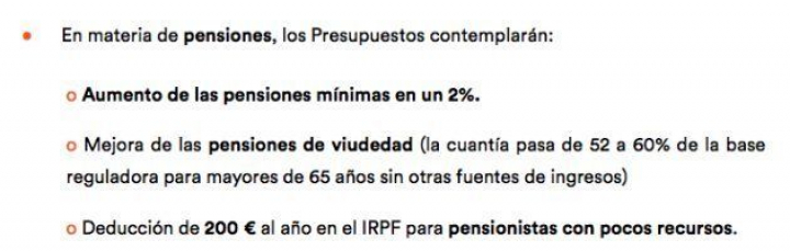 Además, Rivera ha anunciado otras novedades que incluirán los presupuestos para los pensionistas. Ambos partidos han acordado un complemento fiscal negativo para aquellos que perciban una prestación de entre 600 y 1.000 euros al mes. Aproximadamente el 60% de los pensionistas (5,4 millones de personas) reciben cada mes menos de 1.000 euros, según las estadísticas de la Seguridad Social.