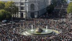 Decenas de miles de personas han saludado en Cibeles la llegada de las cabeceras de las columnas, nutridas en esos momentos por miles de personas que aún se encontraban cerca de los puntos de partida.
