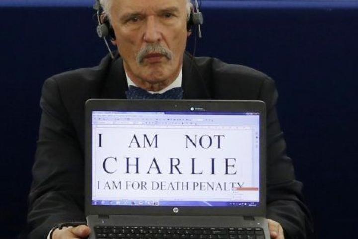 Racista, machista, ultraderechista y favorable a la pena de muerte -como puedes ver en la imagen que ilustra esta noticia-, este polémico eurodiputado polaco fue suspendido en el 2015 a 10 días de sueldo y se le impuso una multa de 3.000 euros por haber hecho el saludo nazi durante un debate en el pleno sobre billetes de transporte.