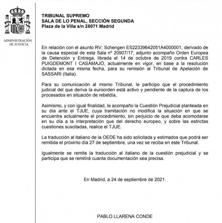 De momento, y con el debate de si la euroorden está o no suspendida, como alega la defensa del exmandatario, no existe comunicación oficial de las autoridades judiciales italianas al Supremo, que la esperan a primera hora de la mañana de hoy.