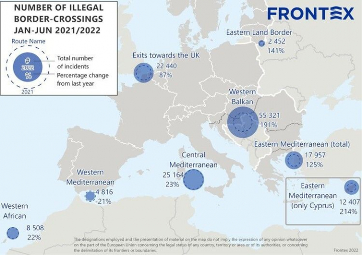 En la primera mitad de 2022, la Unión Europea ha vivido un aumento importante de llegadas de migrantes de forma irregular. Según datos del Frontex, la agencia europea encargada de la vigilancia de fronteras y costas, se registraron más de 114.000 entradas, lo que supone casi duplicar la cifra del mismo periodo de 2021. Los datos no incluyen las personas que huyeron de la guerra de Ucrania que superan ya los 7 millones.