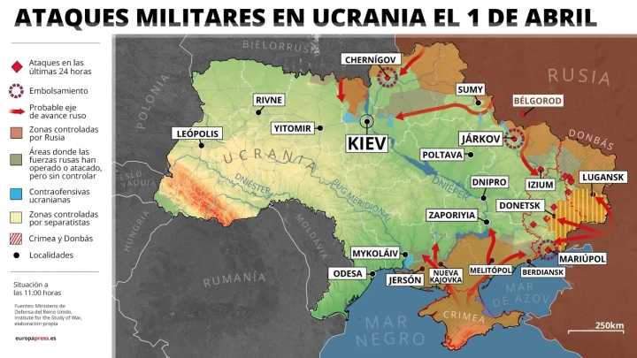 Comienza el cuadragésimo día de invasión rusa de Ucrania: los cuerpos de civiles descubiertos en la ciudad de Bucha tras la retirada de las tropas rusas, siguen suscitando la repulsa internacional, mientras continúan los combates en el sureste del país y el asedio de la ciudad de Mariúpol.