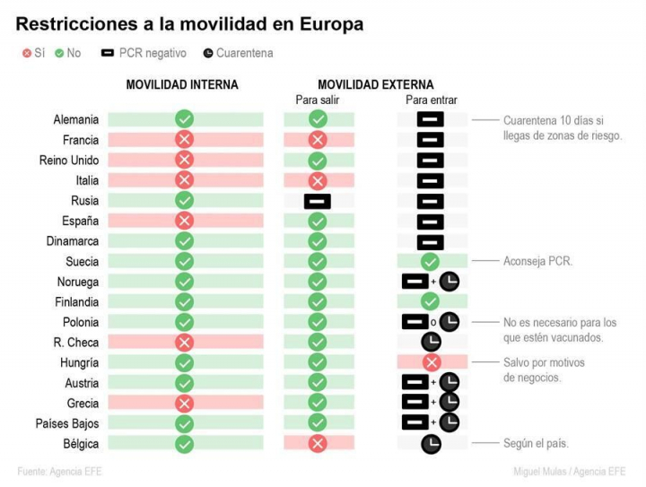 Sí, aunque siempre en función de las normas de cada país. Como podemos ver en el gráfico, hay países más laxos como Finlandia, que deja entrar, y Suecia, que aconsejan (no obliga) una PCR negativa.
