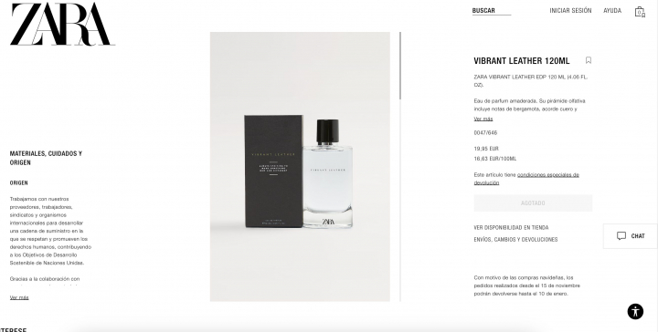 Su versión de 120 mililitros cuesta 19,95 euros pero está agotada online. En la web de Zara hay un buscador para localizar la tienda más cercana en la que está disponible, pero suele aparecer el mensaje de que no ha sido posible encontrarla.