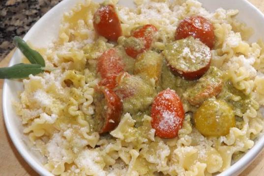 INGREDIENTES: 350 gramos de pasta seca, 150 gramos de tomates cherry, seis cucharadas de pesto, mantequilla, cinco bayas, sal marina, pimienta y queso parmesano rallado.