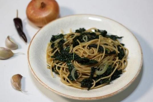 INGREDIENTES: dos manojos de kale o cualquier otra col, 100 gramos de pasta integral, una cebolla, seis dientes de ajo, aceite de oliva y guindilla.