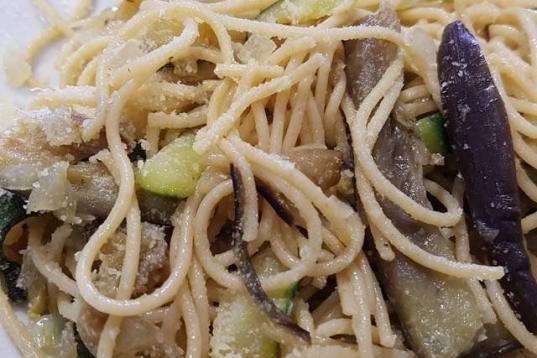 INGREDIENTES: espaguetis, berenjena, calabacín, cebolla, sal, aceite de oliva y parmesano.