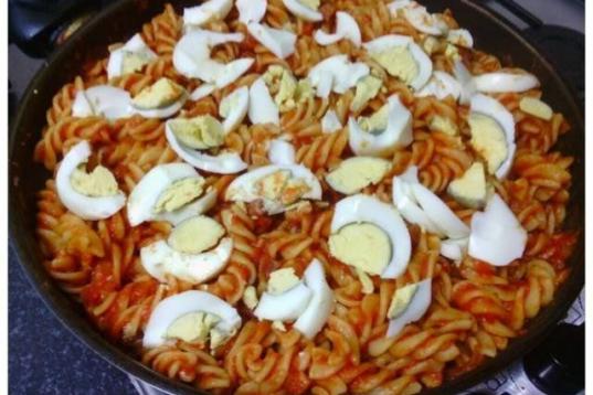 INGREDIENTES: un paquete de fusilli, cuatro huevos, una lata de tomate triturado, un brick pequeño de tomate frito, 1/2 cebolla, dos o tres ajos, 1/2 pastilla de caldo, sal, azúcar y cuatro cucharadas aceite de oliva...