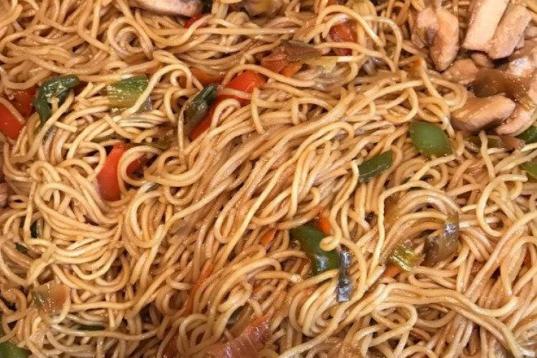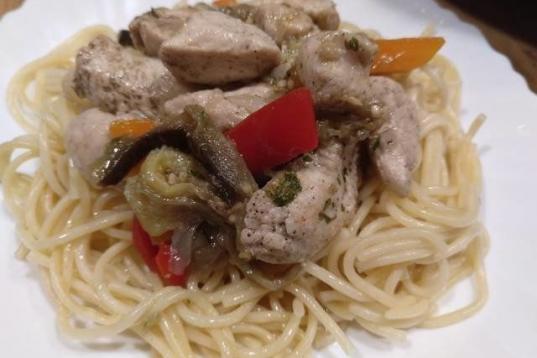 INGREDIENTES: espaguetis y pavo o pollo salteado con verduras.