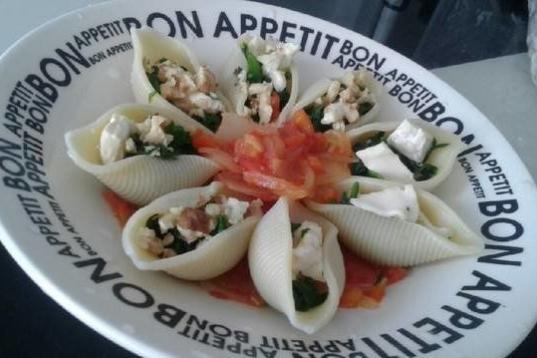 INGREDIENTES: una cebolla, un tomate, 1/2 pimiento rojo , queso brie, nueves, 1/2 paquete de espinaca y ocho conchiglioni.