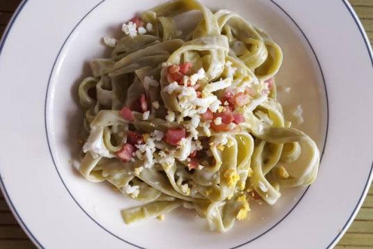 INGREDIENTES: seis o siete nidos de tallarines de espinacas, salsa tres quesos, huevo y lonchas de bacon.