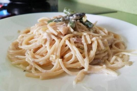 INGREDIENTES: 200 gramos de espaguetis, un puerro, un manojo de espárragos frescos, frutos secos y nata.