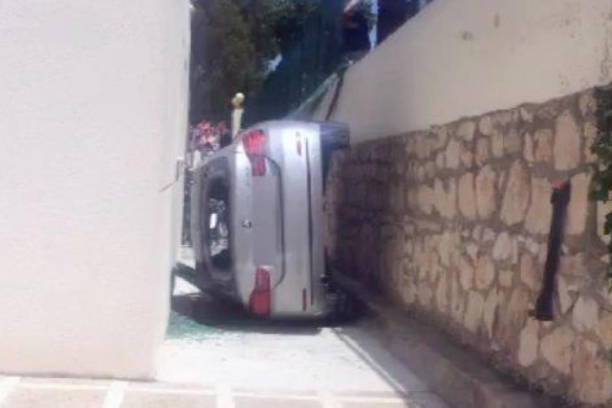 Tremendo susto en la localidad alicantina de Benissa, donde ayer jueves un vehículo acabó volcado en el patio del colegio público Manuel Bru.