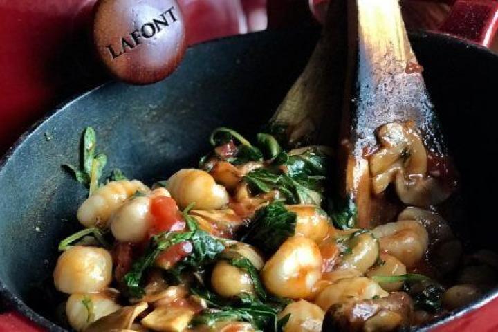 Gnocchi de patata con rúcula, romero, tomate San Manzano y hongos