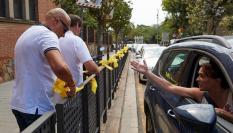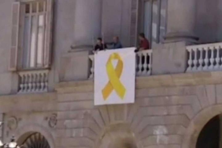 Pocos minutos después del anuncio de Sanz, sobre las 15.00 horas, dos operarios han salido al balcón del Ayuntamiento que da a la plaza Sant Jaume y han desplegado una pancarta con el lazo amarillo.