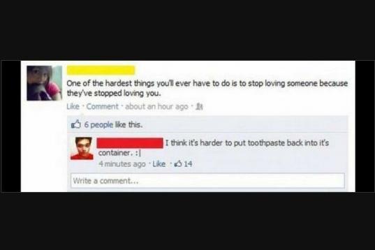 Si alguien suelta el típico rollo sobre tener que dejar de amar a alguien que te ha dejado de amar... puedes contestarte que aún más difícil es volver a poner la pasta de dientes dentro del tubo.
