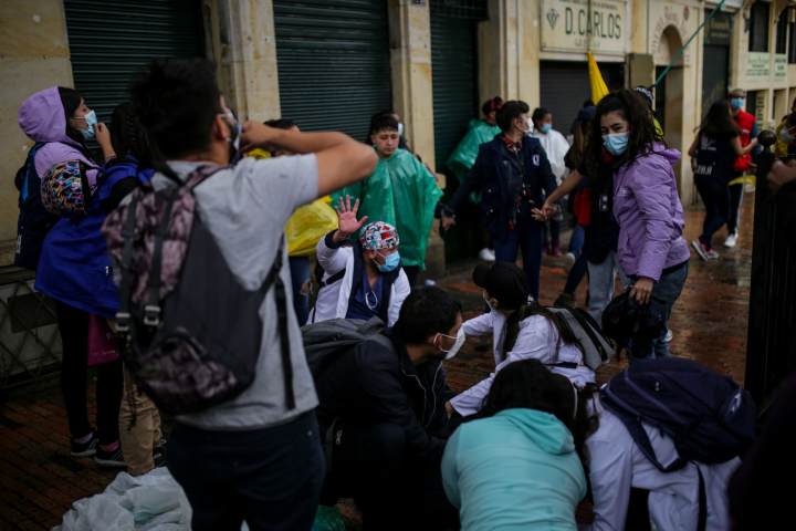 En primera línea de las protestas se encuentran los más jóvenes. Colectivos estudiantiles que se organizan desde la universidad. Muchos de ellos retransmiten en directo las protestas o graban con sus móviles vídeos para después subirlos a las redes sociales. Estos colectivos están “muy criminalizados” en Colombia, explica Márquez. “El movimiento estudiantil siempre está al frente de las protestas y los estudiantes están estigmatizados. Nos hemos encontrado con judicializaciones falsas, estudiantes con cargos de terrorismo cuando no era así…”.
