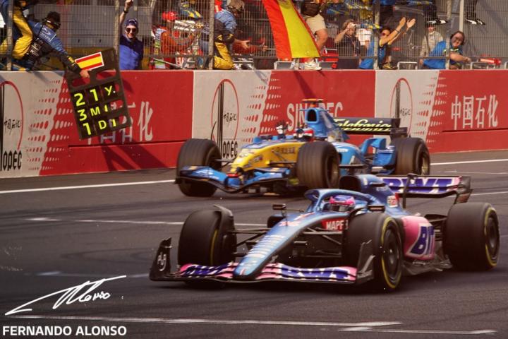 Tras la carrera, la escudería francesa ha publicado un montaje en el que celebra el nuevo récord del piloto asturiano. Una imagen en la que se ve el coche de Renault, actual Alpine, con la que logró el campeonato del mundo, junto al vehículo con el que compite actualmente.
