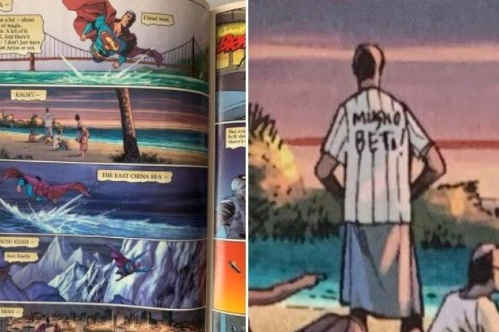 Por ejemplo, Arturo Pérez-Reverte “conoció” a Clark Kent en un vuelo a Kazajistán... O el propio Superman vistiendo una camiseta que reza ‘Musho Beti’. El mítico Chiquito de la Calzada tiene su “hueco” en estos comics, cuando aparecen dos policías, identificados como ‘Grijander’ y ‘Gromenahuer’.