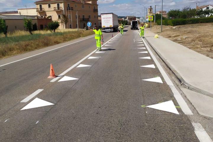 Por ahora, esas nuevas marcas se han pintado sobre el asfalto en la travesía de Nava de Roa (Burgos) en la N-122, entre los km 293,652 y 294,356.