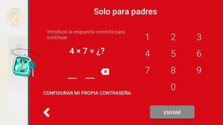 Al acceder a la opción de configuración, localizada en la parte inferior derecha de la pantalla de inicio, te pedirá una operación matemática para comprobar que se trata de un adulto. A pesar de esto, para mayor seguridad, tendrás que introducir la contraseña de la cuenta de Gmail con la que se configuró en un primer momento.