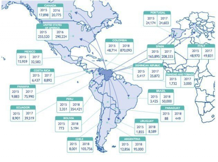 En este mapa de la Organización Internacional para las Migraciones se puede ver los destinos de los migrantes venezolanos, atendiendo a las fuentes oficiales:
