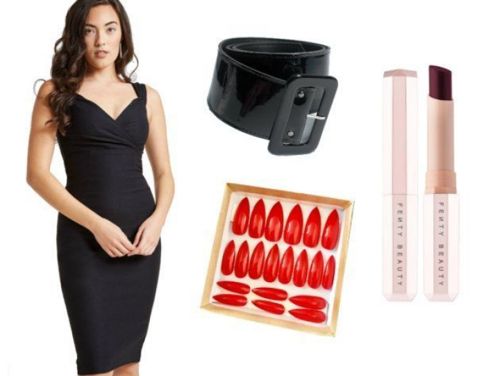 Vestido ajustado negro corto, cinturón ancho negro, uñas postizas rojas y pintalabios burdeos. HuffPost Spain