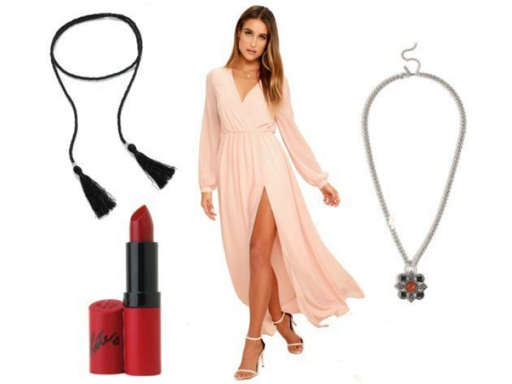 Cinta negra con borlones, vestido largo rosa claro con raja, collar plateado con piedra y pintalabios rojo oscuro. HuffPost Spain