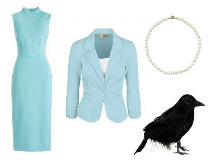 Vestido entallado celeste, americana celeste, collar de perlas y cuervo de plástico. HuffPost Spain