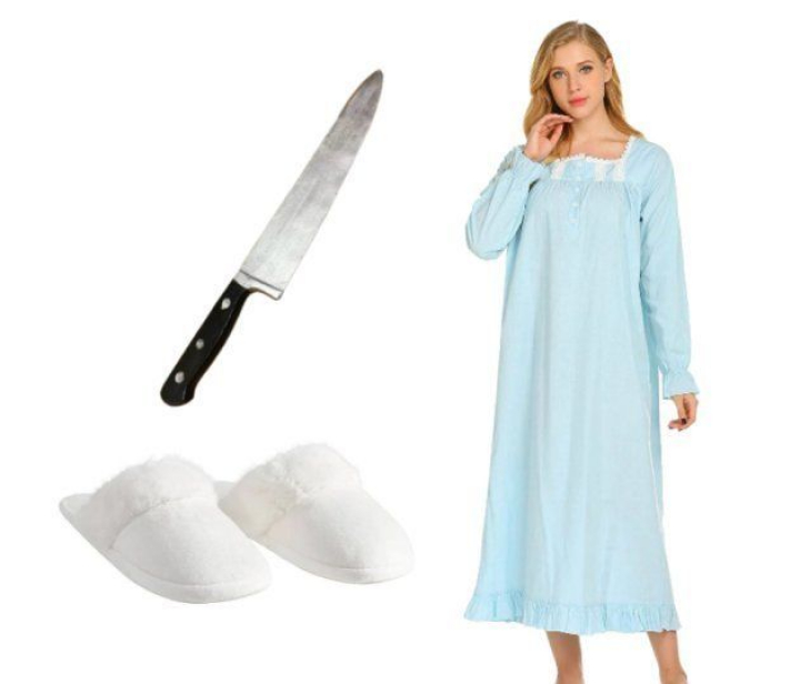 Camisón celeste, zapatillas de estar por casa blancas y un cuchillo de plástico. HuffPost Spain