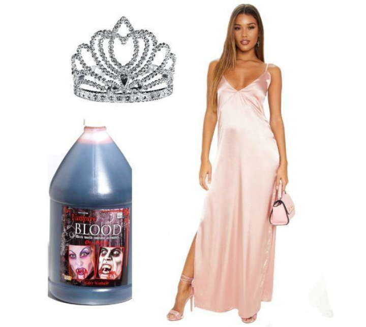 Camisón de raso rosa, bolso a juego, diadema y bote de sangre falsa. HuffPost Spain