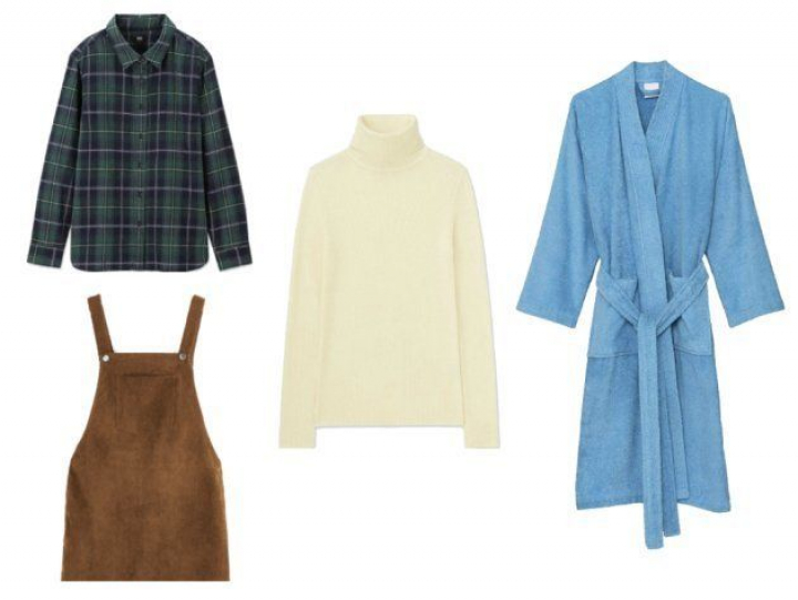 Camisa de cuadros, peto marrón, jersey de cuello vuelto color crema y albornoz azul. HuffPost Spain