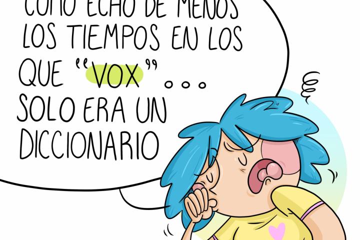 Cómo echo de menos los tiempos en los que "vox"... solo era un diccionarioUna viñeta de Sara Jotabé. Sara Jotabé 28/04/2021 a las 15:43 Facebook Twitter Whatsapp Email síguenos en Sara Jotabé Sara Jotabé viñetas Opinión vox elecciones madrid Un proyecto de Un proyecto de El vínculo que une esta estrella del fútbol femenino y un mito del Real Madrid (y su emotivo reencuentro) Newsletter Recibe las notificaciones más importantes en tu correoapúntate a nuestro boletín Últimas noticias Lucía Casal, 22 años, lleva una ganadería de 500 terneros y sufrió bullying en el instituto por subir fotos con vacas: "Me decían que no me lavaba" Tercera subasta desierta en San Sebastián: intentan vender un piso de 75 metros cuadrados por 200.000 euros pero solo ofrece dos tercios de la propiedad Un presidente se reúne con Trump y confirma al 'New York Times' todas las sospechas: "Está verdaderamente desinformado" Pocos conocen la señal de tráfico S‑991c de la DGT, pero no respetarla puede costarte 200 euros y 4 puntos En 'Le Monde' retratan la red de agitadores de extrema derecha acreditados en el Congreso: "Si nos echan iremos a la calle y será más complicado y más agresivo" Los turcos alucinan con el parecido de uno de sus deportistas más importantes con un ministro español: hasta él lo comenta No solo Rosalía: qué ha pasado para que no se hable del feminismo como se hacía en el 8M de 2018 Encina, 65 años, hija del pionero del vaquero en Ponferrada: "En los 70 era la locura absoluta, todo el mundo quería uno" Ben Stiller desmonta la última 'película' de la Casa Blanca con un mensaje de premio El pub más remoto de Nueva Zelanda está en una 'república' autoproclamada de 20 habitantes donde te sellan el pasaporte por 2 dólares: una familia acaba de comprarlo para criar ahí a sus hijos