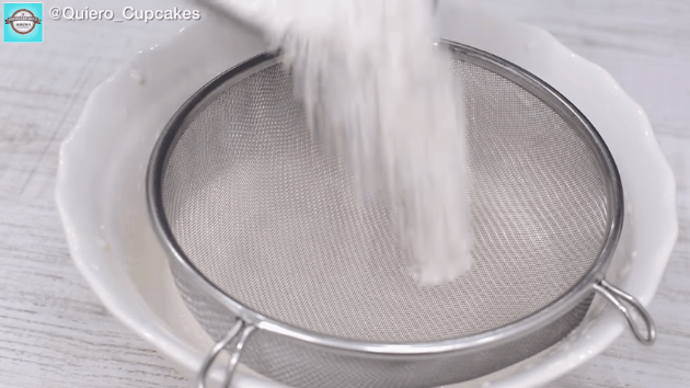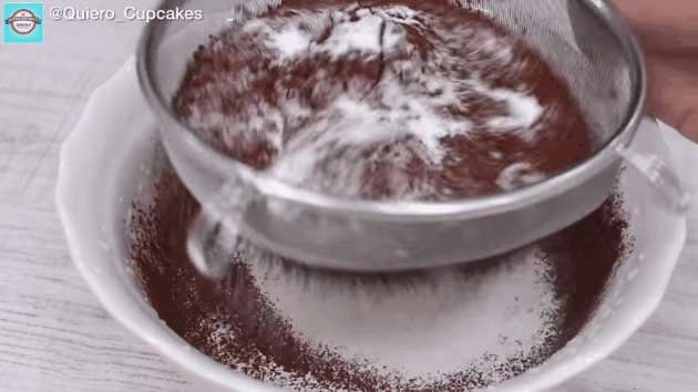 5. Colocar un colador sobre la mezcla e incorporamos la harina, el cacao y la levadura.