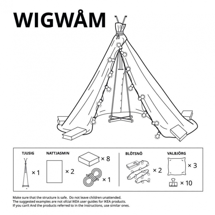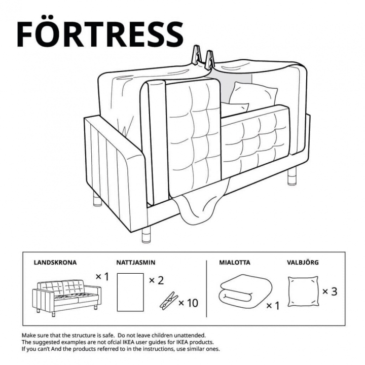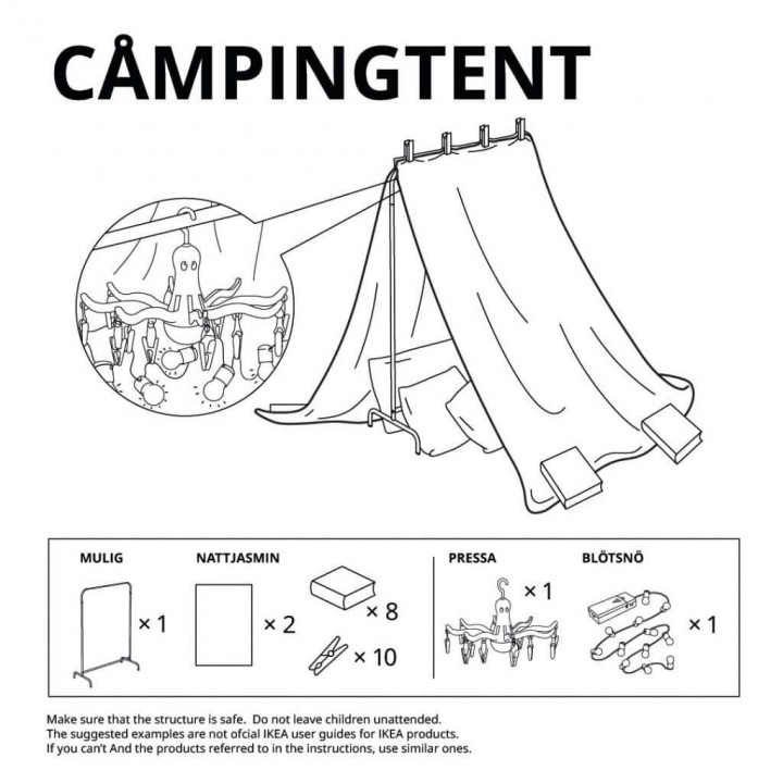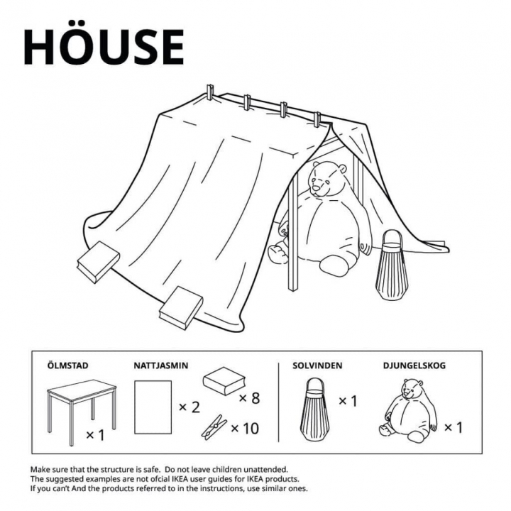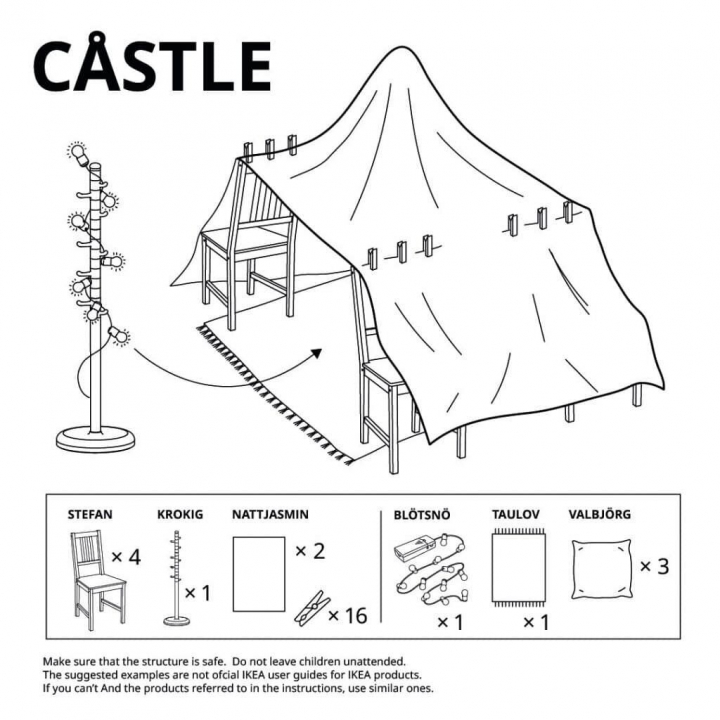 Obviamente, los elementos que se necesitan son muebles o accesorios de IKEA que uno puede tener en casa, aunque también se pueden buscar alternativas similares entre nuestro mobiliario. Al fin y al cabo basta con disponer de pinzas de la ropa, una manta, un sofá y libros pesados para levantar cualquiera de estas viviendas dentro de casa.