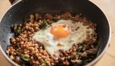 Ingredientes: guisantes congelados, cebolla, jamón, huevo, mostaza, pimentón y ajo en polvo.Receta completa en Cookpad
