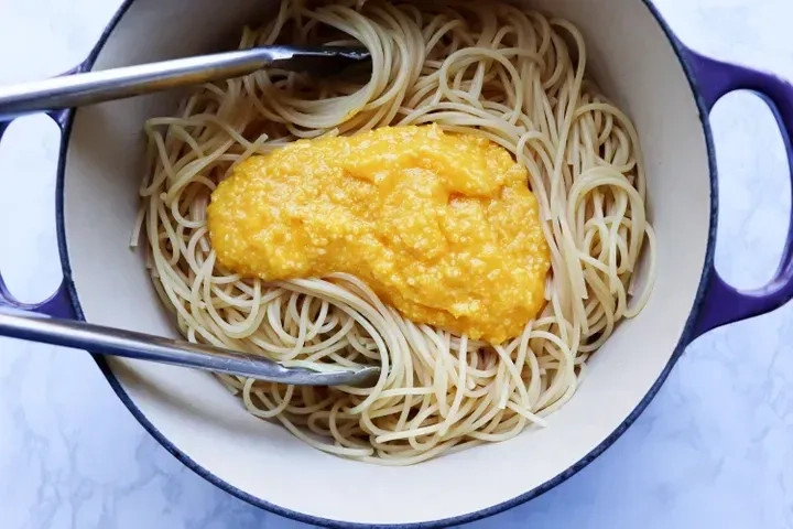 6. Rápidamente, añade la mezcla de huevo y queso a los espaguetis y no dejes de remover hasta que se forme una salsa brillante. Añade más agua de la pasta si hace falta.