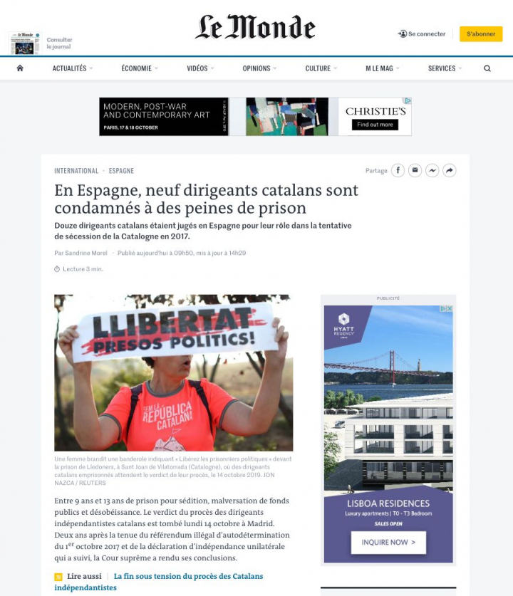 A través de una alerta, el francés Le Monde recalca que sólo nueve de los doce dirigentes acusados irán a prisión por sedición y no por rebelión como pedía la Fiscalía.