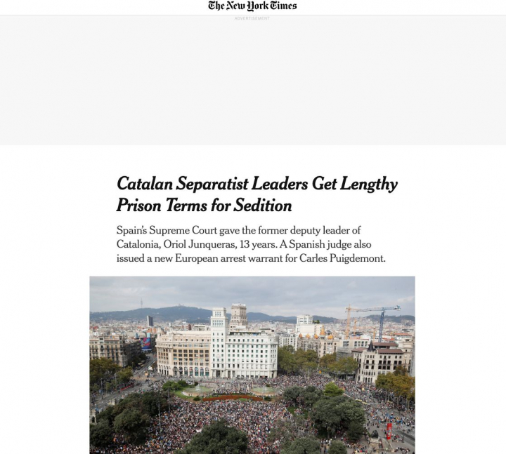 Igual que The Guardian, también The New York Times califica la sentencia de “extensa”, centrando su información en el ex vicepresidente catalán Oriol Junqueras, quien ha tenido la mayor condena: 13 años de cárcel. La resolución de este juicio “trascendental” llega a menos de un mes de las elecciones generales en España, apunta el corresponsal en Madrid Raphael Minder, al tiempo que recuerda que los líderes catalanes todavía pueden apelar ante el Tribunal Constitucional y ante la justicia europea.