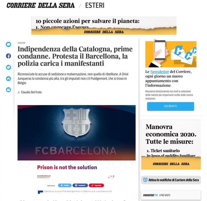 Asimismo, el Corriere della Sera destaca que “entre los condenados no está Carles Puigdemont”. “El ex jefe del Gobierno catalán logró fugarse al extranjero (ahora se encuentra en Bélgica) antes del arresto”, explica el periódico italiano.