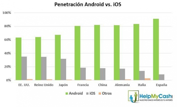 Si bien se trata de una proporción nada desdeñable, teniendo en cuenta que dicha porción de la tarta está en manos de una única compañía, frente a las decenas de empresas que comercializan terminales con Android, la penetración de Apple en nuestro país está más cerca de países como Brasil (5,4 %) o Argentina (3,8 %) que de nuestros vecinos europeos, así como de Australia, Japón, China y, por supuesto, de Estados Unidos.