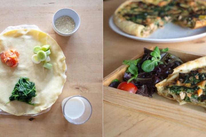 ▶️ Ingredientes (4 personas): masa quebrada, 3 huevos, 300 gramos de espinacas cocidas, 1 puerro cortado en rodajas, 1 lomo o rodaja de salmón en tacos (sin piel y sin espinas), 2/3 vaso de leche, queso parmesano rallad...