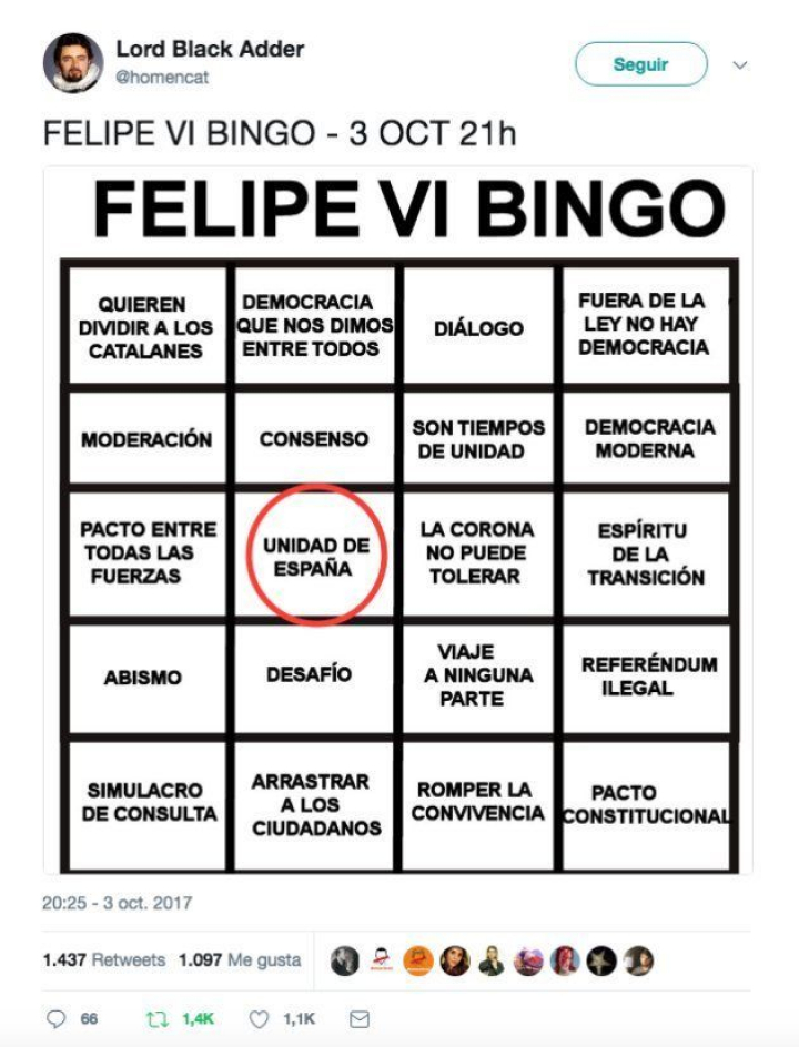 Minutos antes de que el rey Felipe VI se dirigiese a la nación este martes, el usuario de Twitter Lord Black Adder publicó uno de los tuits más difundidos.