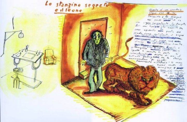 La muestra se organiza en varias salas en las que se proyectan los tres cortos, rodados en el año 1993 y que acabó pocos meses antes de morir. Se acompañan de los dibujos que dieron origen a las ideas y de fotografías del rodaje, lo que permite conocer el proceso de trabajo del cineasta de principio a fin. Los cortos, Sueño del túnel, Sueño del déjeuner sur l'herbe y Sueño del león en el sótano, comparten la misma trama y el mismo protagonista. El actor Paolo Villaggio interpreta a un hombre perturbado por sus sueños —un túnel que se derrumba sobre él, un tren que se dispone a atropellarlo mientras permanece atado a las vías y un león que aparece repentinamente en su casa respectivamente—, que acude a visitar a su psicólogo (Fernando Rey) para pedir consejo y termina preguntando qué hacer con su dinero. Se encuentra siempre con la misma respuesta: "Me ocupo de problemas psicológicos, para el resto está la Banca di Roma".