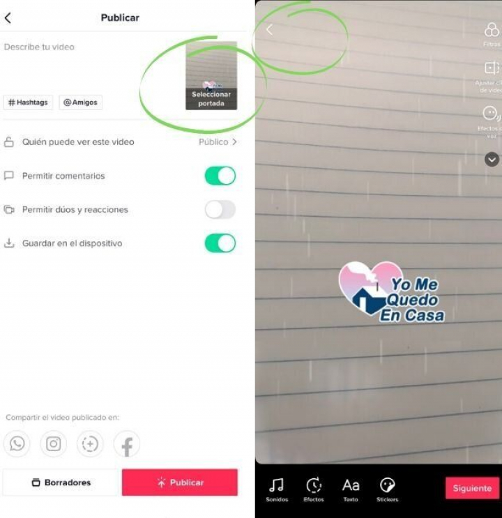 Los vídeos no tienen por qué hacerse del tirón, se pueden hacer montajes cambiando de ropa, de escenario, de protagonistas... Ahí es donde entra en juego Guardar en Borradores. Mientras un vídeo no llegue a 60 segundos puedes ir añadiendo fragmentos, ese mismo día, el siguiente o incluso una semana después. Lo dejas en borradores y ya lo recuperarás.
