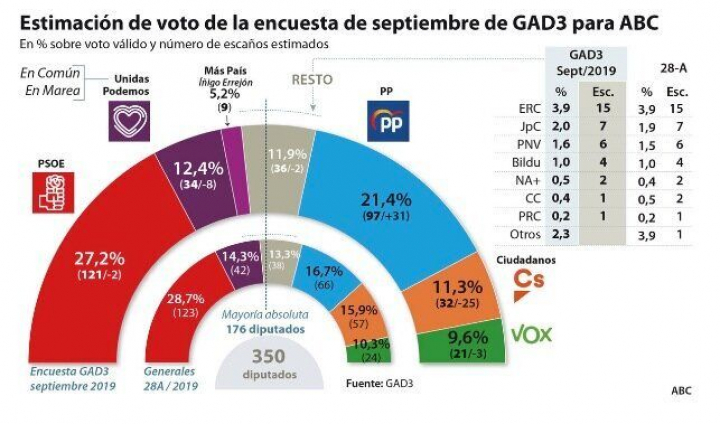 Con la nueva situación, toca tirar todas las encuestas a la basura salvo la de este jueves –GAD3 para ABC– que incluye por primera vez a Más País. La neófita formación entraría con 9 diputados en la Cámara Baja y lograría el psicológico 5%, mientras que sus rivales en la izquierda bajarían ligeramente respecto a las anteriores elecciones: el PSOE pasaría de 123 a 121 y UP de 42 a 34.