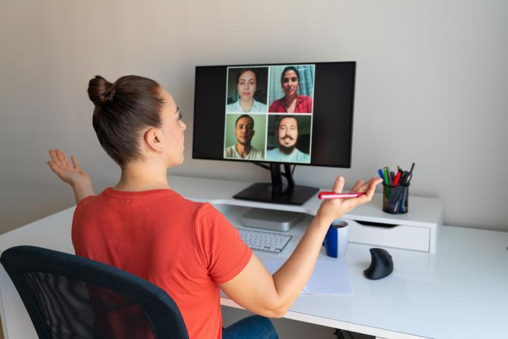 Una mujer gesticula durante una reunión de trabajo por videoconferencia.RainStar via Getty Images